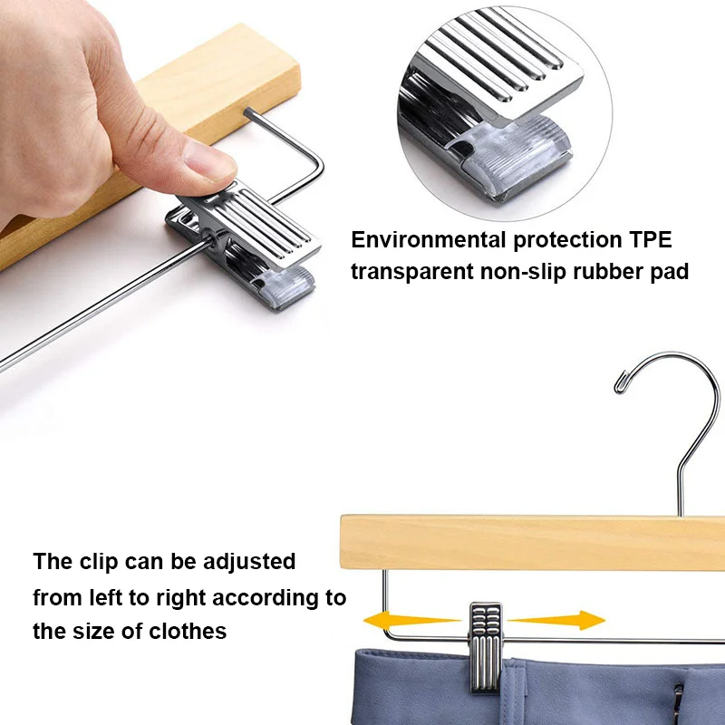 Crafted from durable and sustainable wooden materials, these hangers are built to last. The sturdy construction ensures that your favorite trousers, skirts, dresses, and pants remain securely hung without slipping off. Say goodbye to wrinkled clothing and unorganized closets - these hangers are here to streamline your wardrobe and keep your outfits looking fresh and crisp.